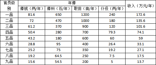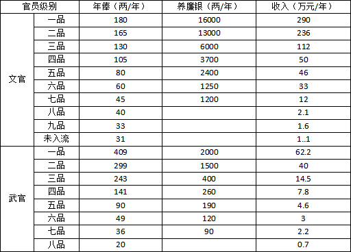 清朝官员年俸并不高,但存在养廉银制度,以养廉银的名义额外发放补贴,其中京官的养廉银由国库支出,一般很少,主要还是依靠年俸,而外官的养廉银则要远高于其工资。